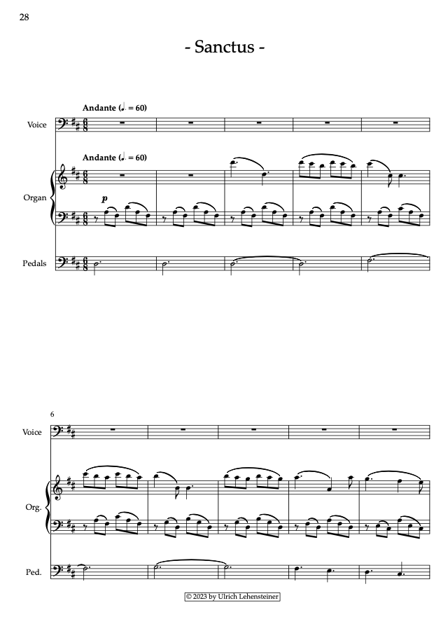 Ulrich Lehensteiner's "Intimate Mass" offers a traditional mass setting on a formally very reduced scope; scored for solo voice and organ, it depicts a person's inner journey from spiritual uncertainty and doubt to confidence across its five parts (while retaining the original latin-mass-text), combining traditional dramatic settings with more upbeat, pop-like elements, such as the final part, the Agnus Dei.